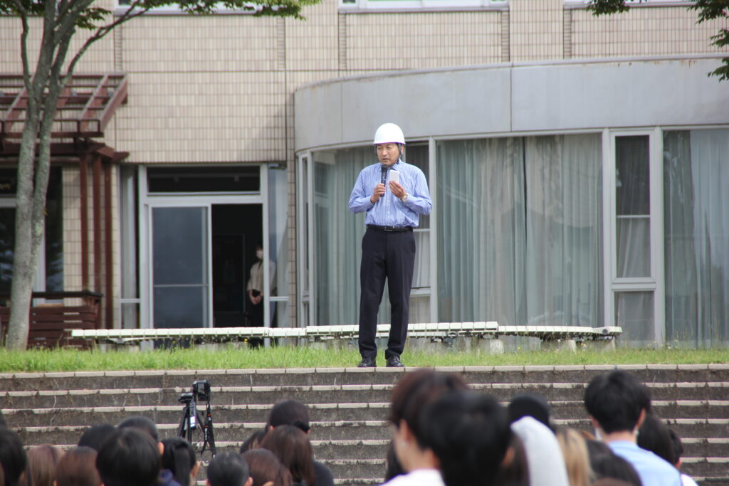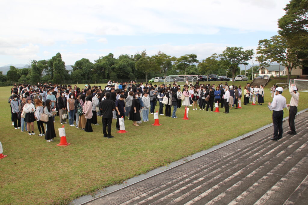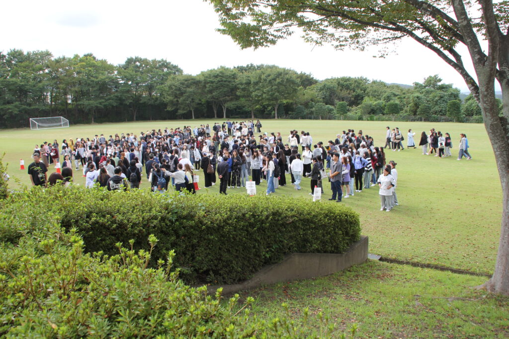 学内で授業を受けていた学生と勤務中の教職員の参加により、11時45分から始まった訓練では、緊急時の校内放送に従って学生や教職員が各教室や体育館、視聴覚室からグラウンドに避難しました。学生らは教職員の指示を受けて、出火地点と想定された1 階学生食堂厨房付近から遠い経路を歩き、避難地点に到着してからは整列して点呼を取りました。約8分でグラウンドへの全員の避難が完了し、三浦学長から講評をいただき、12時過ぎに終了しました。