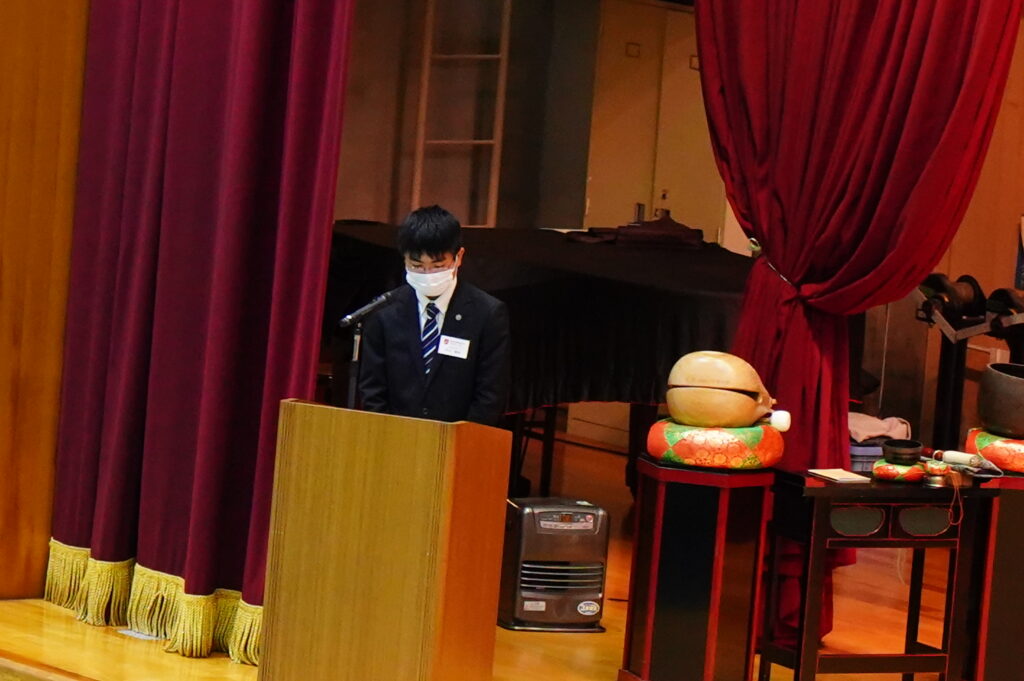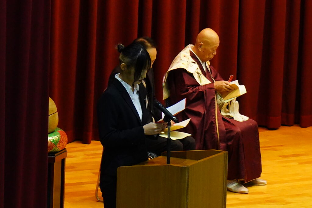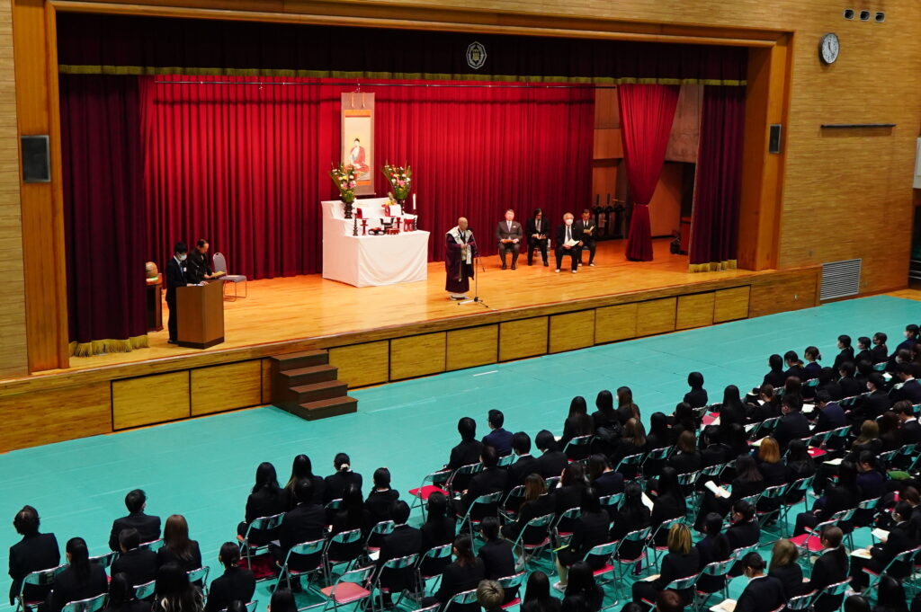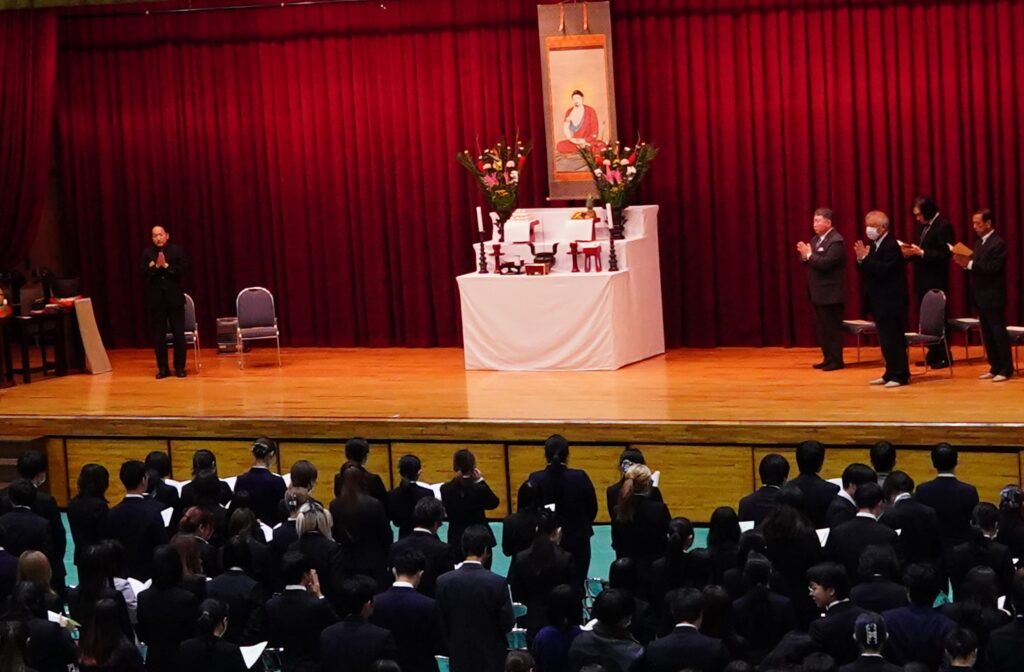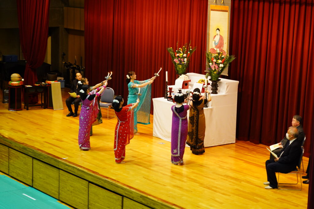 成道会は、お釈迦さまが6年間に及ぶ修行や苦行の末、12月8日の暁の頃に「お悟り」を開かれて、仏陀(ぶっだ)になられたことを讃え、本学が毎年開催している仏教行事です。式典は、開式のことば、礼拝、聖歌(三帰依文)、献灯の舞、読経(般若心経)、礼讃文(法句経抄)、学園長法話、理事長挨拶、聖歌(四弘誓願)、閉式のことば、礼拝の順に行われました。献灯の舞は、仏教青年会委員6名が披露しました。学園長法話は導師でもある鎌田文惠学園長より、理事長挨拶は伊澤勝平理事長よりそれぞれお言葉をいただきました。