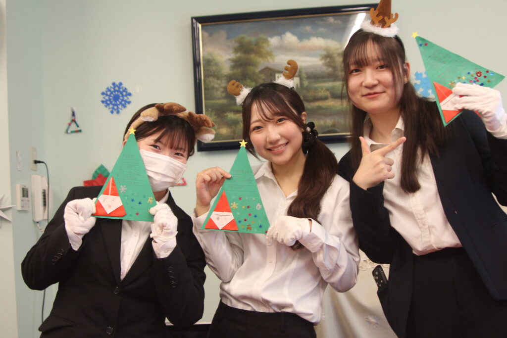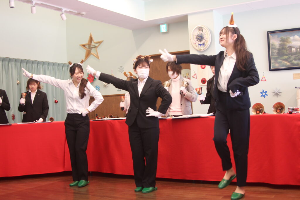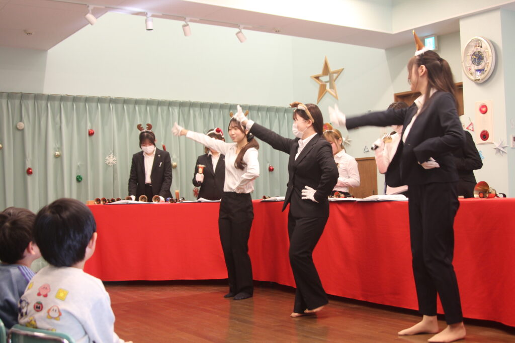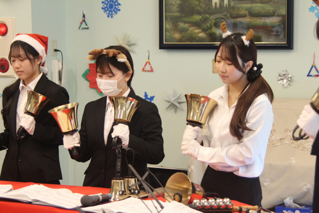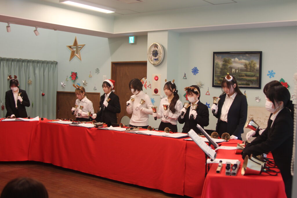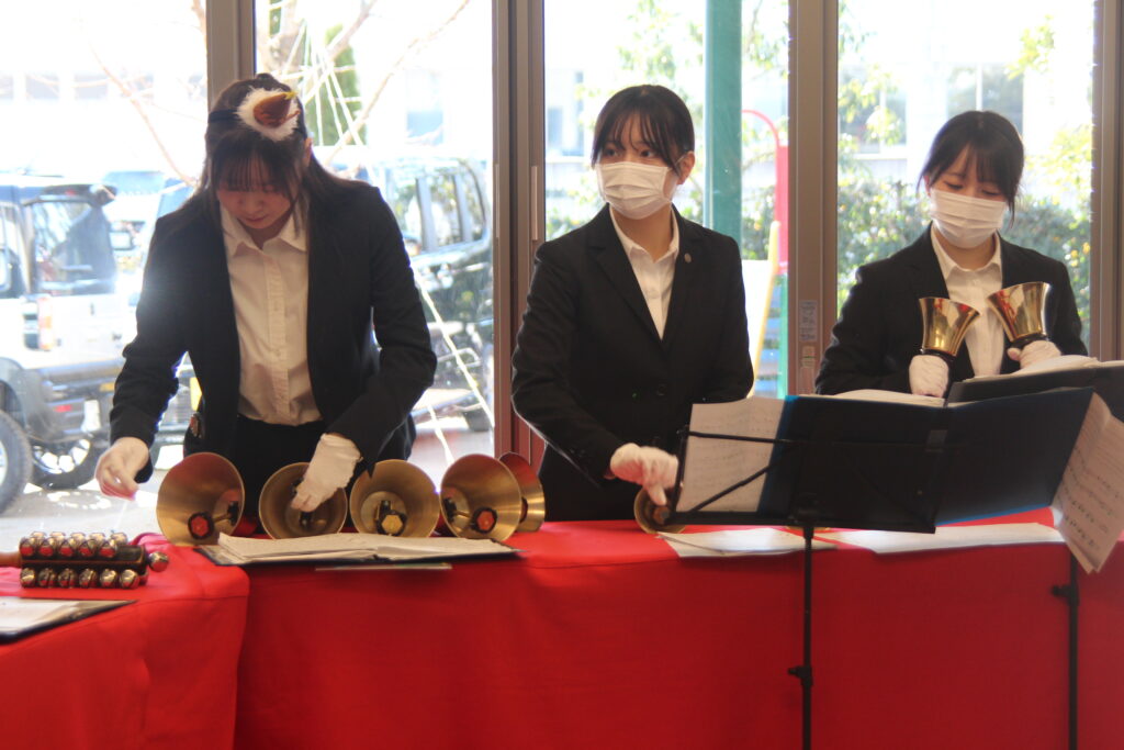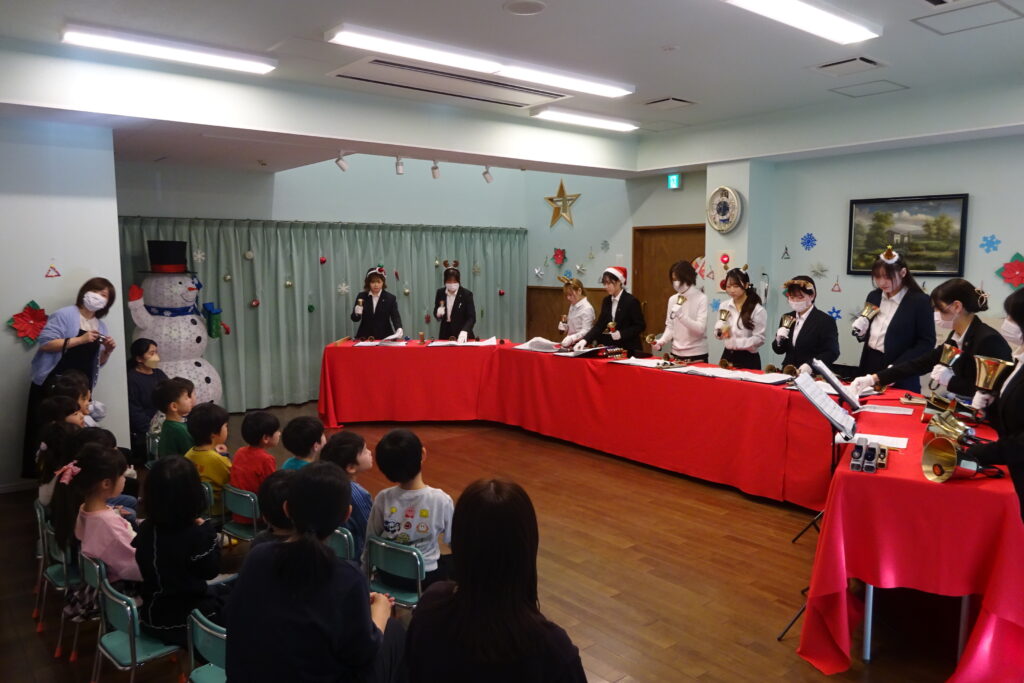 この日は、「5歳児対象クリスマスコンサート」のイベントに本学のハンドベルチーム“リンガーズ”が招待されました。10時から演奏が始まり、前半は「アンパンマンのマーチ」と「ミッキーマウスマーチ」、その後クイズと楽器体験を行い、後半は「あわてんぼうのサンタクロース」「赤鼻のトナカイ」「クリスマスのおもちゃ箱(クリスマス曲のメドレー)」の計5曲を披露しました。