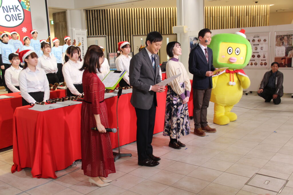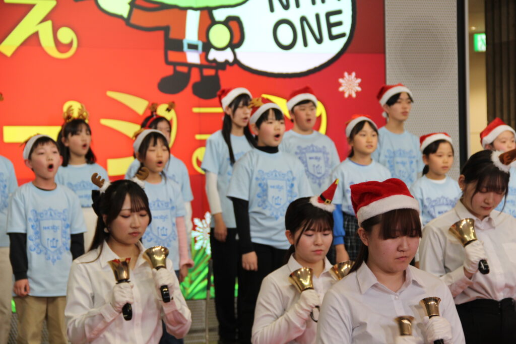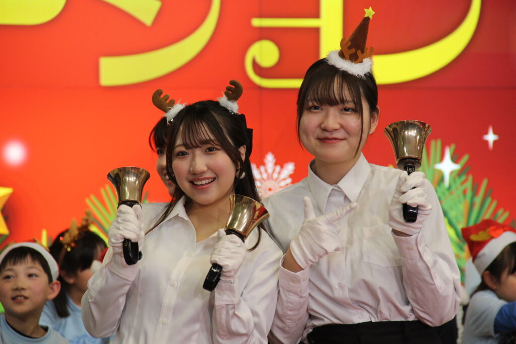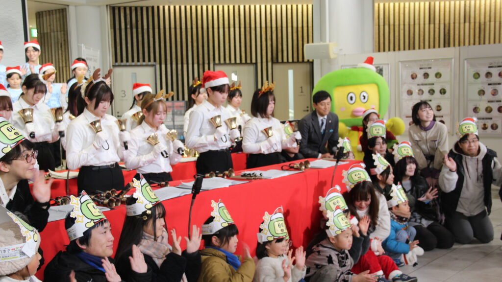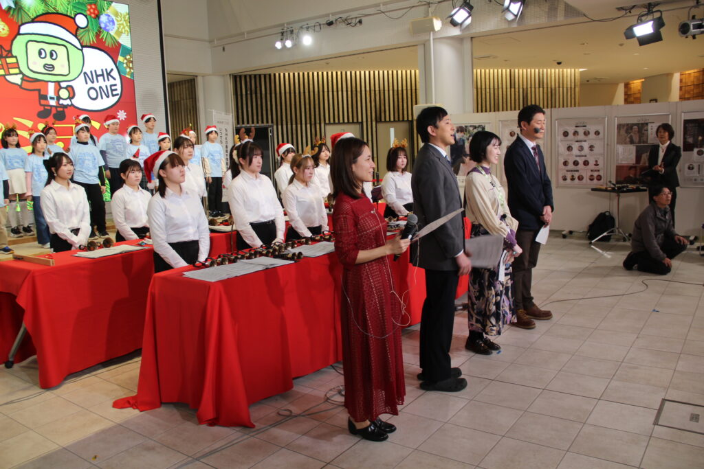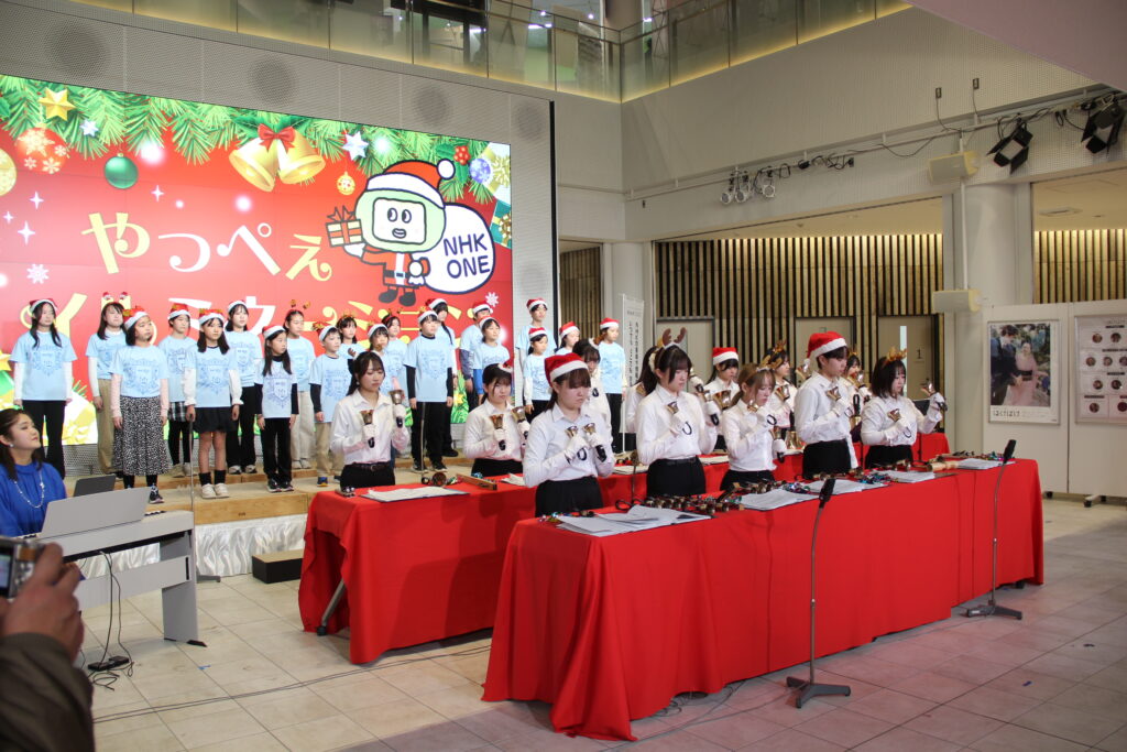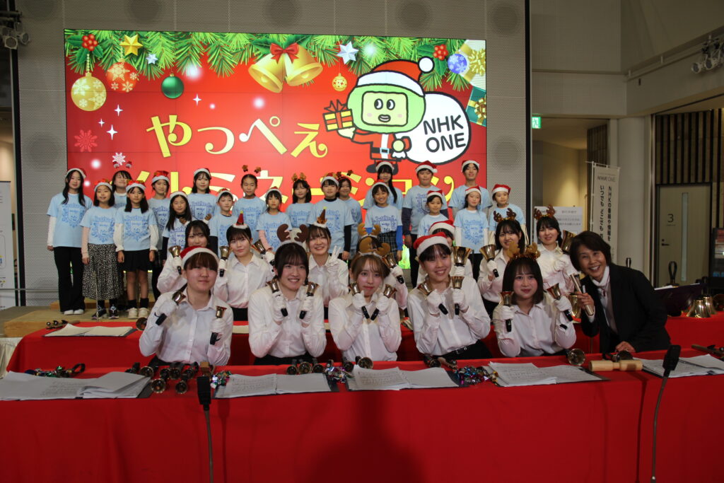 令和7年12月24日(水)、本学保育学科のハンドベルクワイアが昨年に引き続きNHK「てれまさ」に出演してクリスマス曲を演奏しました。1年生6名、2年生5名の計11名です。今年はNHK少年少女合唱団とのコラボもあり、2曲を一緒に演奏・合唱しました。 「てれまさ」のエンディングでの動画は下記からご覧ください。曲は「もろびとこぞりて」です。 リハーサル 本番直前 本番中 本番中 本番中 エンディング 本番終了後のミニコンサート 最後に集合写真「メリークリスマス」