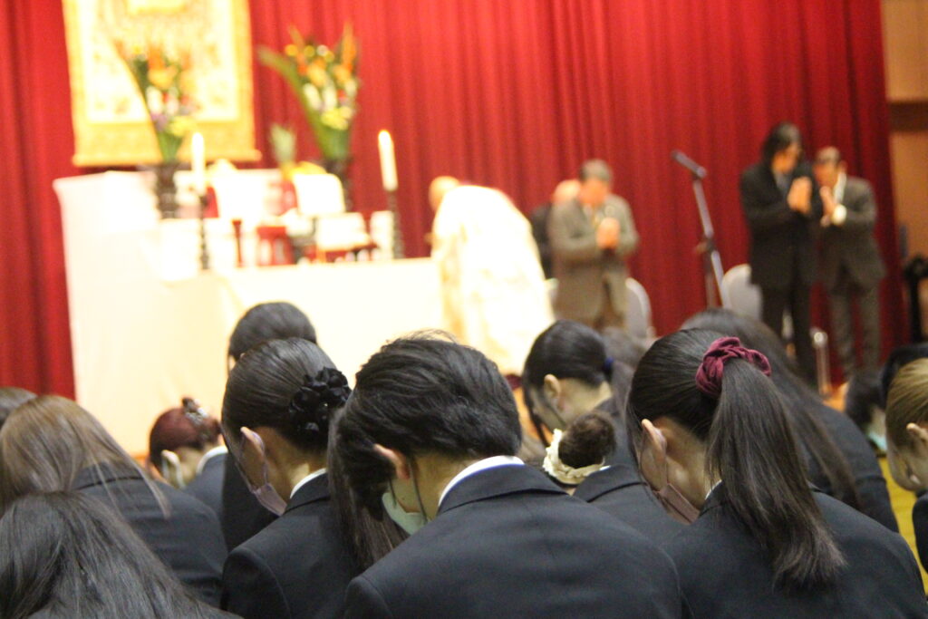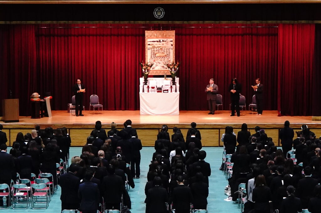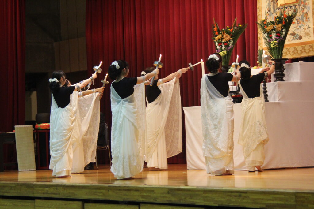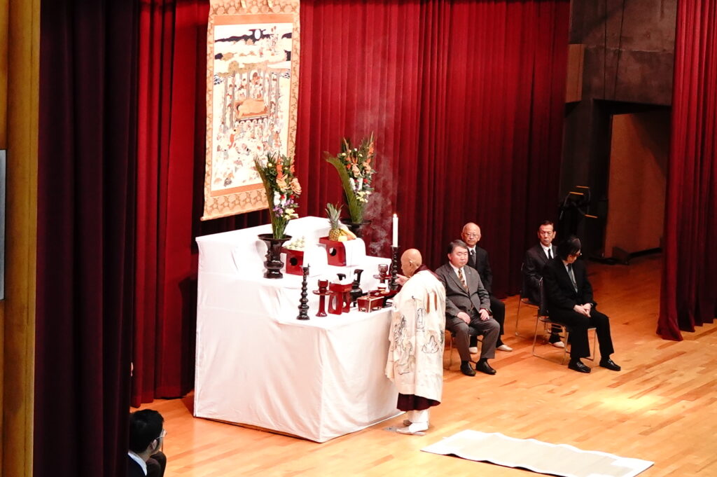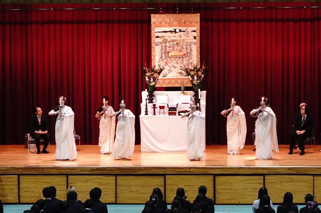 2026年1月14日 (水)、今年度最後となる仏教行事である「涅槃会」を開催しました。お釈迦さまが亡くなって安らかな境地「涅槃」に入られたことを偲ぶ行事です。式典では仏教青年会委員の学生が司会を行い、仏教青年会委員の学生が「献灯の舞」を披露した後に、導師の鎌田文惠学園長が読経を行い、三浦学長の焼香に合わせて学生と教職員が一斉に合掌、礼拝をしました。学園長による法話のあと、来賓としておいでいただいた伊澤勝平理事長よりご挨拶をいただきました。