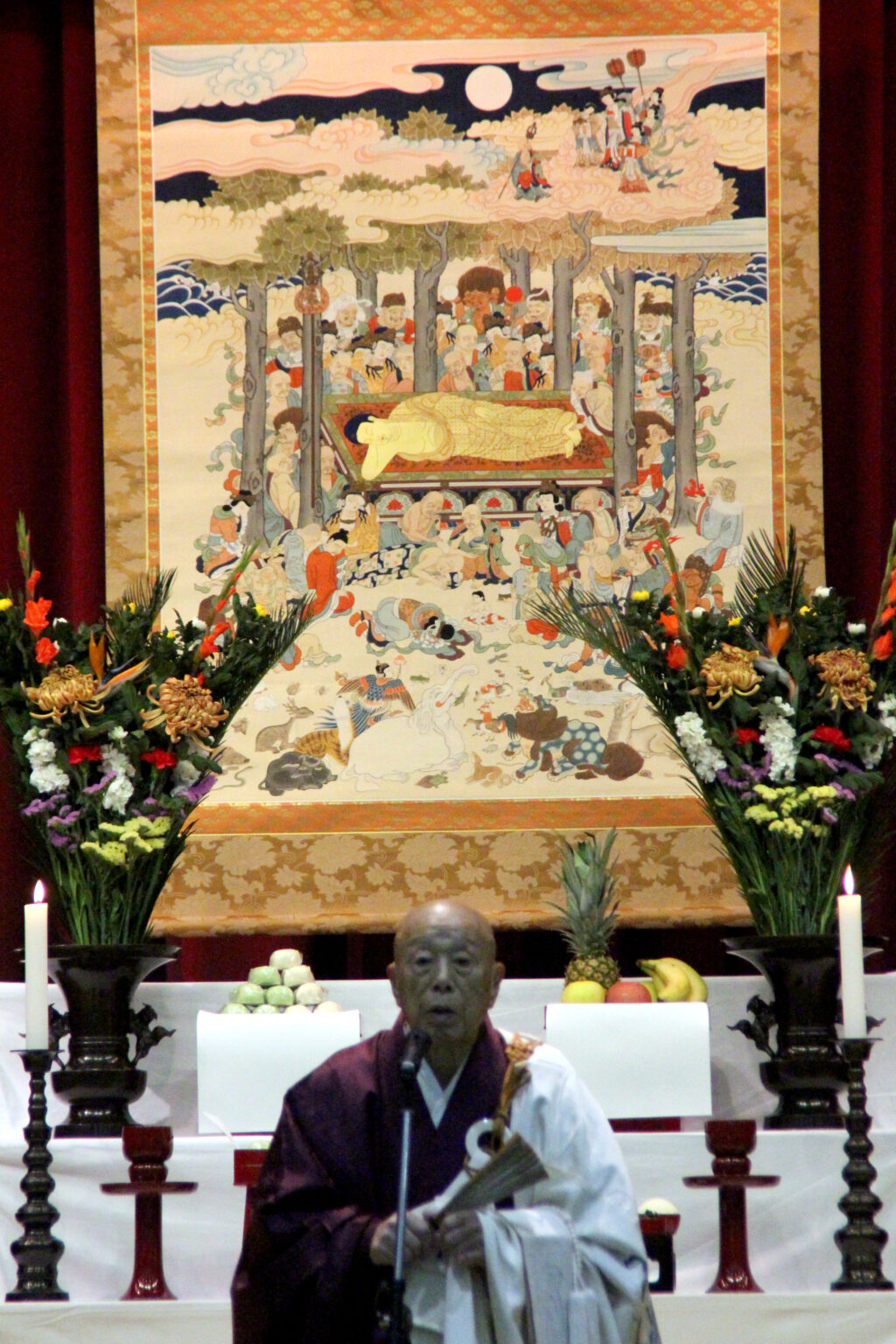 涅槃会はお釈迦様の命日である2月15日に行われる法要ですが、本学では行事日程の都合上、1ヶ月早い1月に行っています。涅槃会の法要には、追悼と報恩という2つの目的があります。「追悼」はお釈迦様が亡くなられたという事実に直面し、その最期を深く悲しみ、偲ぶことが目的です。涅槃図(お釈迦様が沙羅双樹の下で横たわり、弟子や動物たちが嘆き悲しむ様子を描いた絵)を掲げ、お釈迦様への感謝と敬意を込めて供養します。お釈迦様を偲ぶ「追悼」だけでなく、なぜ「報恩」という目的もあるのでしょうか。それは、お釈迦様の教えがあるおかげで、現代の私たちも幸せに生きるヒントを得られるからです。もしお釈迦様の教えがなかったら、現代の私たちは尽きない欲にずっと悩まされていたかもしれません。欲には限りがありません。お釈迦様の教えがあるおかげで、私たちは煩悩に向き合い、目先の欲だけでは手に入らない幸せについて考えられます。涅槃会の法要は、この恩に報いるという意味も持っています。