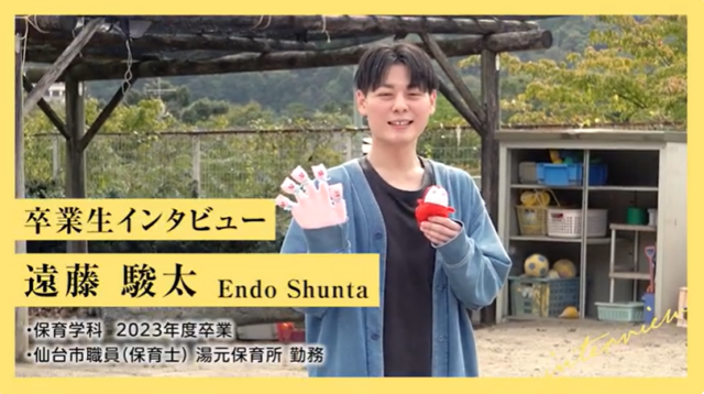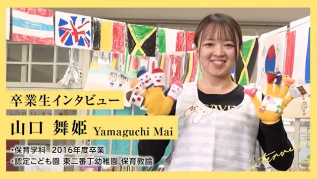 聖和学園短期大学を卒業し、地域で活躍する4名の先輩のインタビュー動画を本学Youtubeチャンネルで公開中です! 聖和短大での学びを通して成長を遂げ、社会においてそれぞれの場所で活躍する先輩方の姿を是非ご視聴ください。 (それぞれの画像をクリックすると視聴することができます)