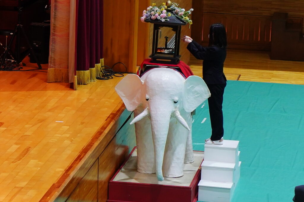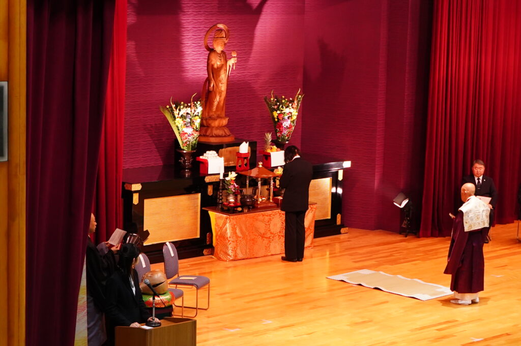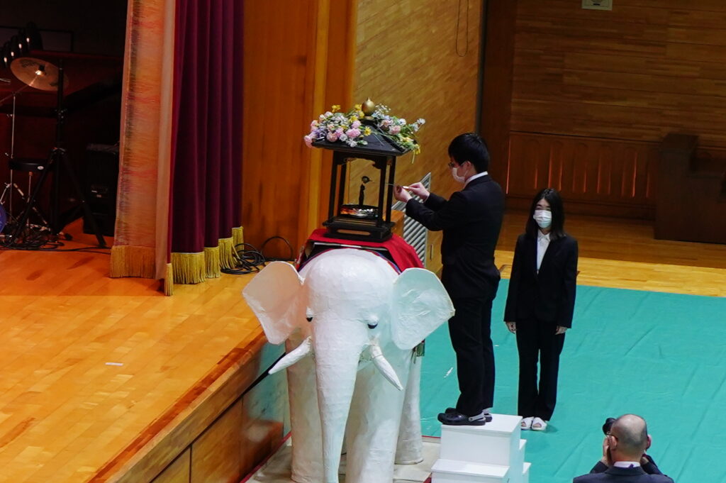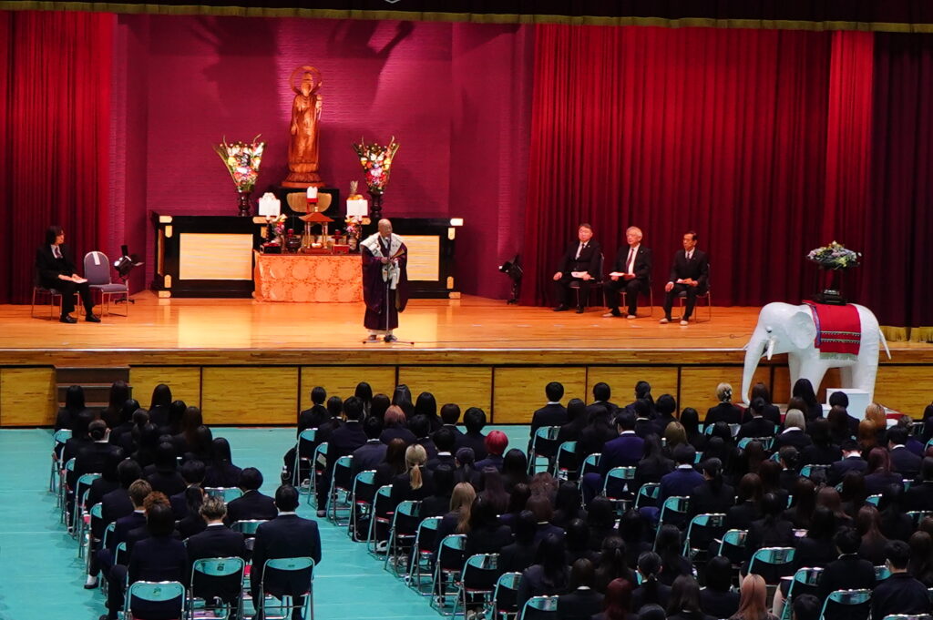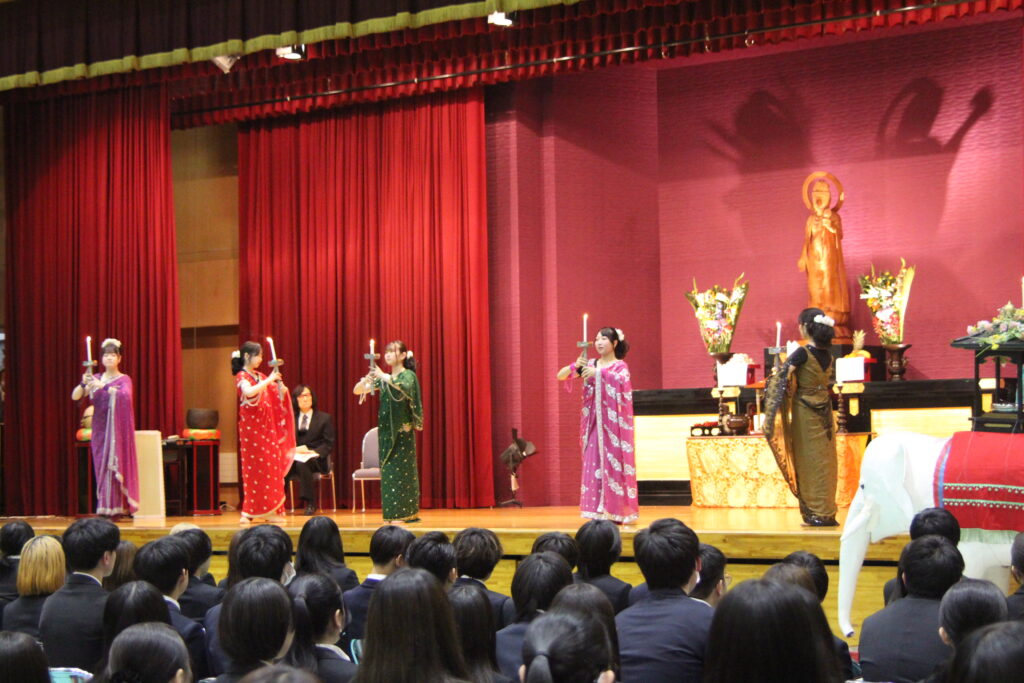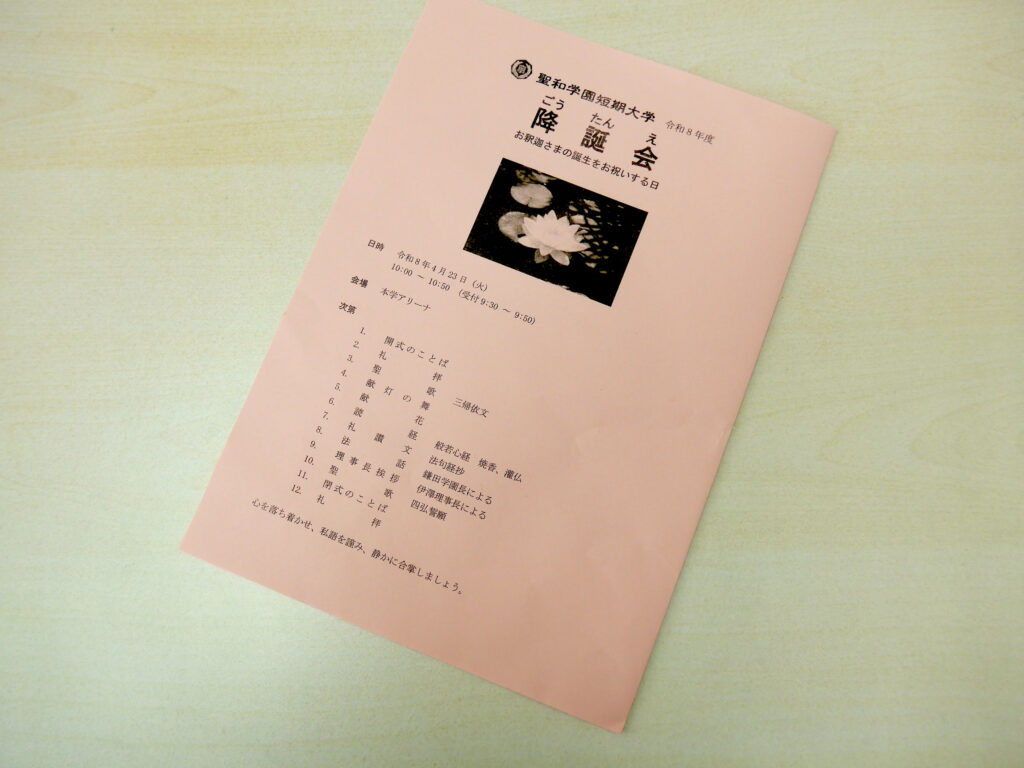 4月23日 (木)、仏教行事「降誕会(ごうたんえ)」を開催しました。お釈迦さまのお誕生を祝う行事です。式典は、聖歌「三帰依文(さんきえもん)」を唱えた後、仏教青年会委員による「献灯の舞」「献花」の後に鎌田文惠学園長を導師として読経を行い、伊澤理事長、千葉副理事長(兼校長)、庄司監事、渡辺学長の焼香の後、学生代表による灌仏(かんぶつ)が行われました。その後、仏教青年会委員による礼讃文(らいさんもん)の朗読に続いて鎌田学園長の法話と伊澤理事長のご挨拶をお聞きし、最後に聖歌「四弘誓願(しぐせいがん)」を唱えて式典は終了しました。