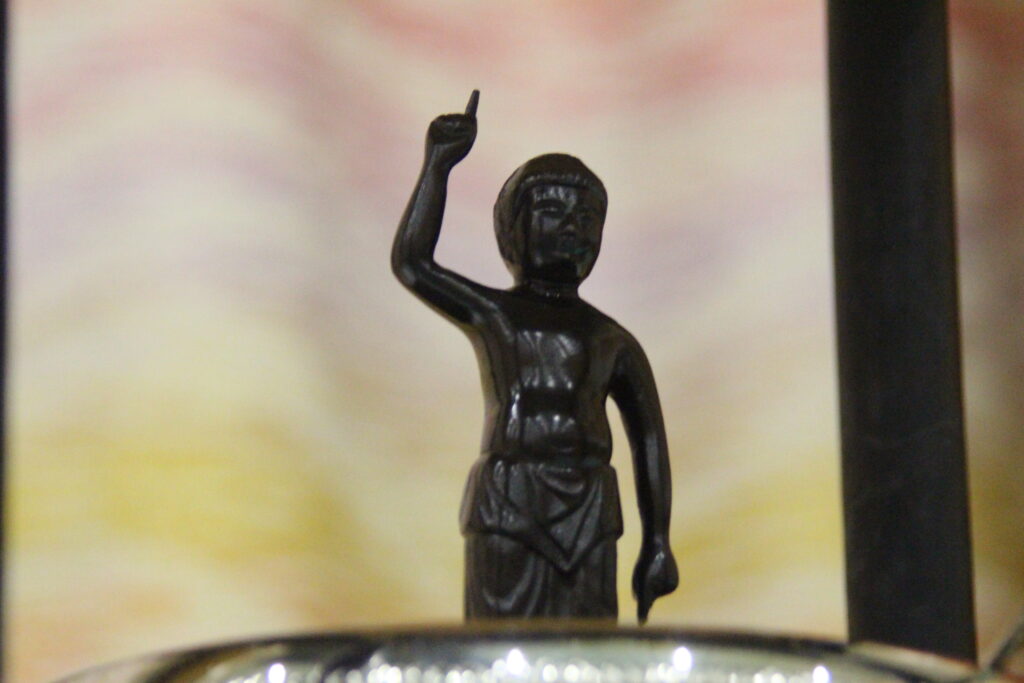 ルンビニーの園で誕生なさった直後、ブッダは自分の足で7歩あるき、 右手で天を、左手で地を指さし、「天上天下唯我独尊」 (天にも地にもわれ一人尊し) とおっしゃいました。 その伝説に従って、 絵画や彫刻で多くの誕生仏像が表現されています。