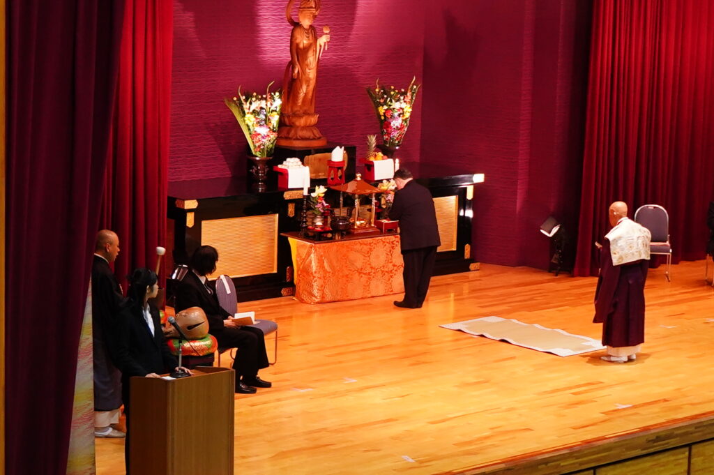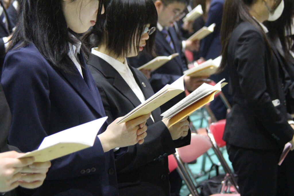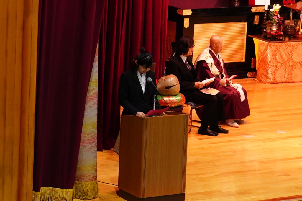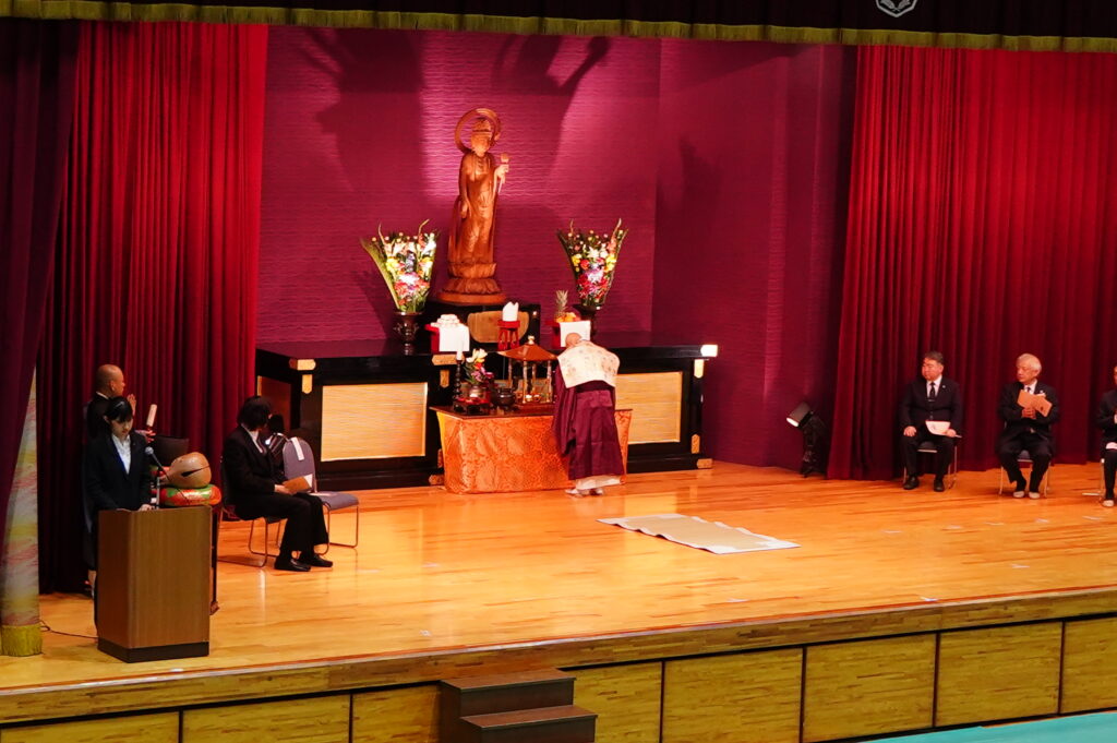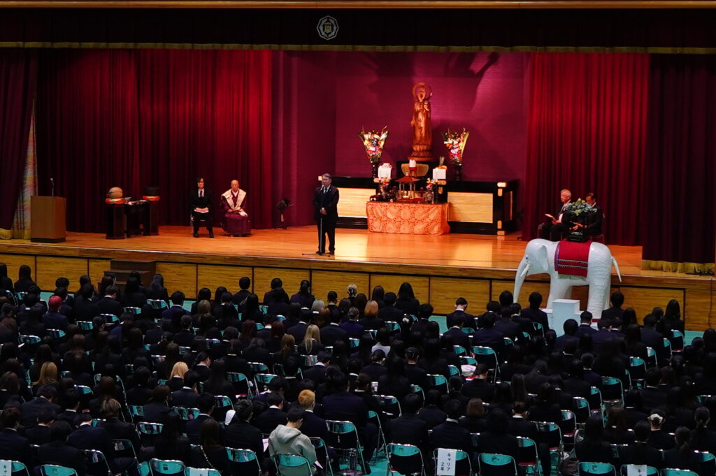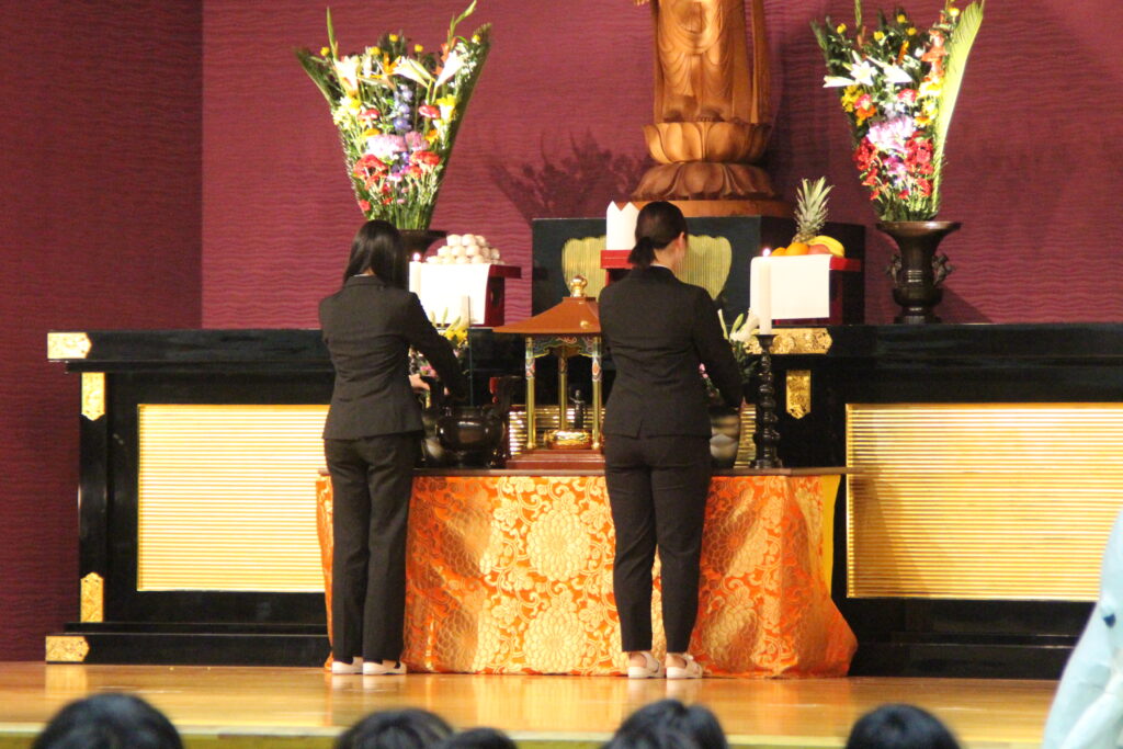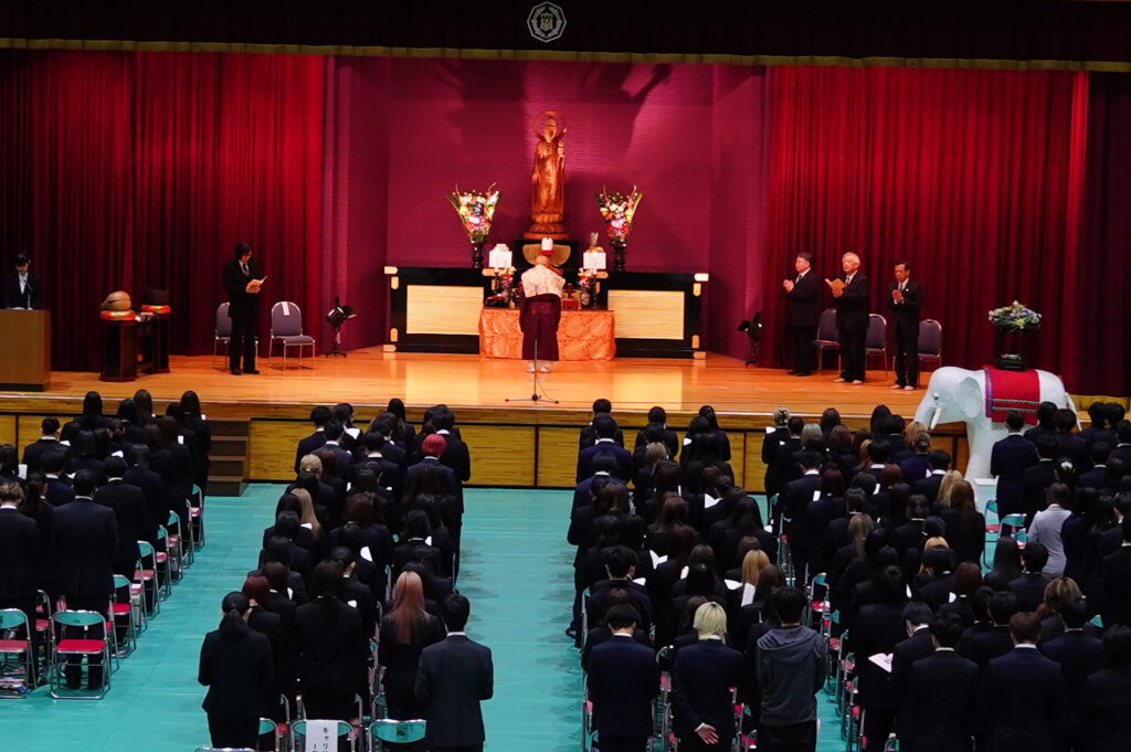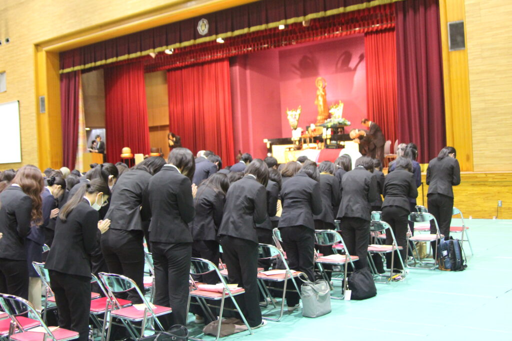 本学にとっては、新しい年度を迎えて最初の仏教行事です。 1年生は、夢と希望をもって本学に入学した目的や意欲を新たに、2年生は、 自分の将来の進路に向けて目標や課題をしっかりと見つめ直す機会として、 式典に臨みました。