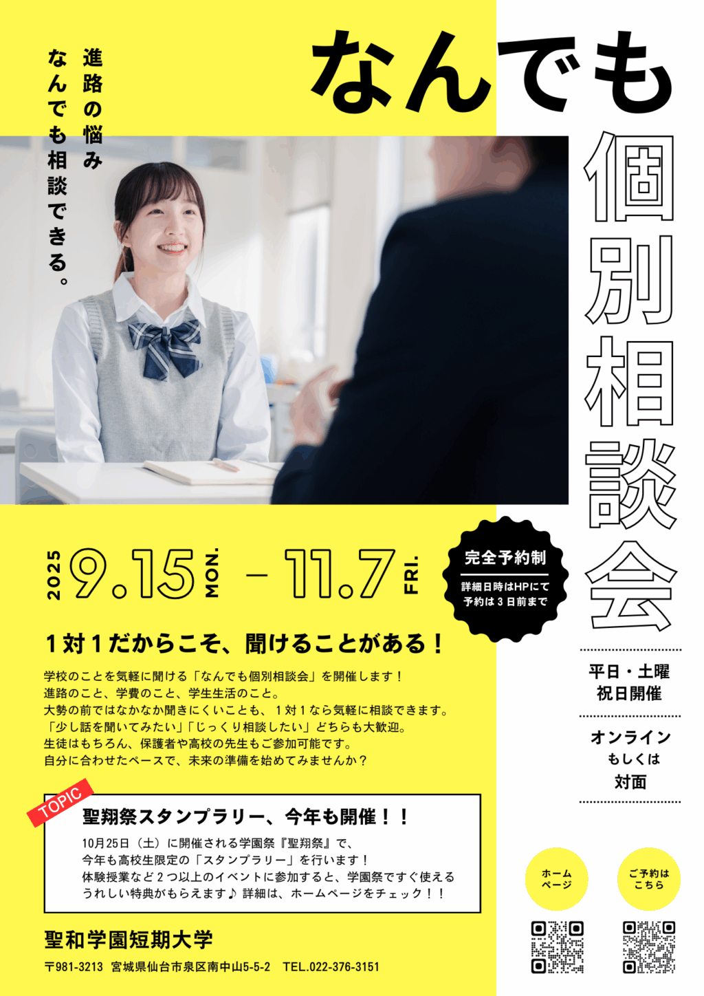聖和短大の学園祭『聖翔祭』では、高校生のみなさんにお得に楽しんでもらえるよう、高校生限定のスタンプラリーを開催します。【体験イベント】いずれか1つと、【個別相談】に参加すると、もれなく聖翔祭の飲食店で使えるチケット1,000円分をプレゼント!